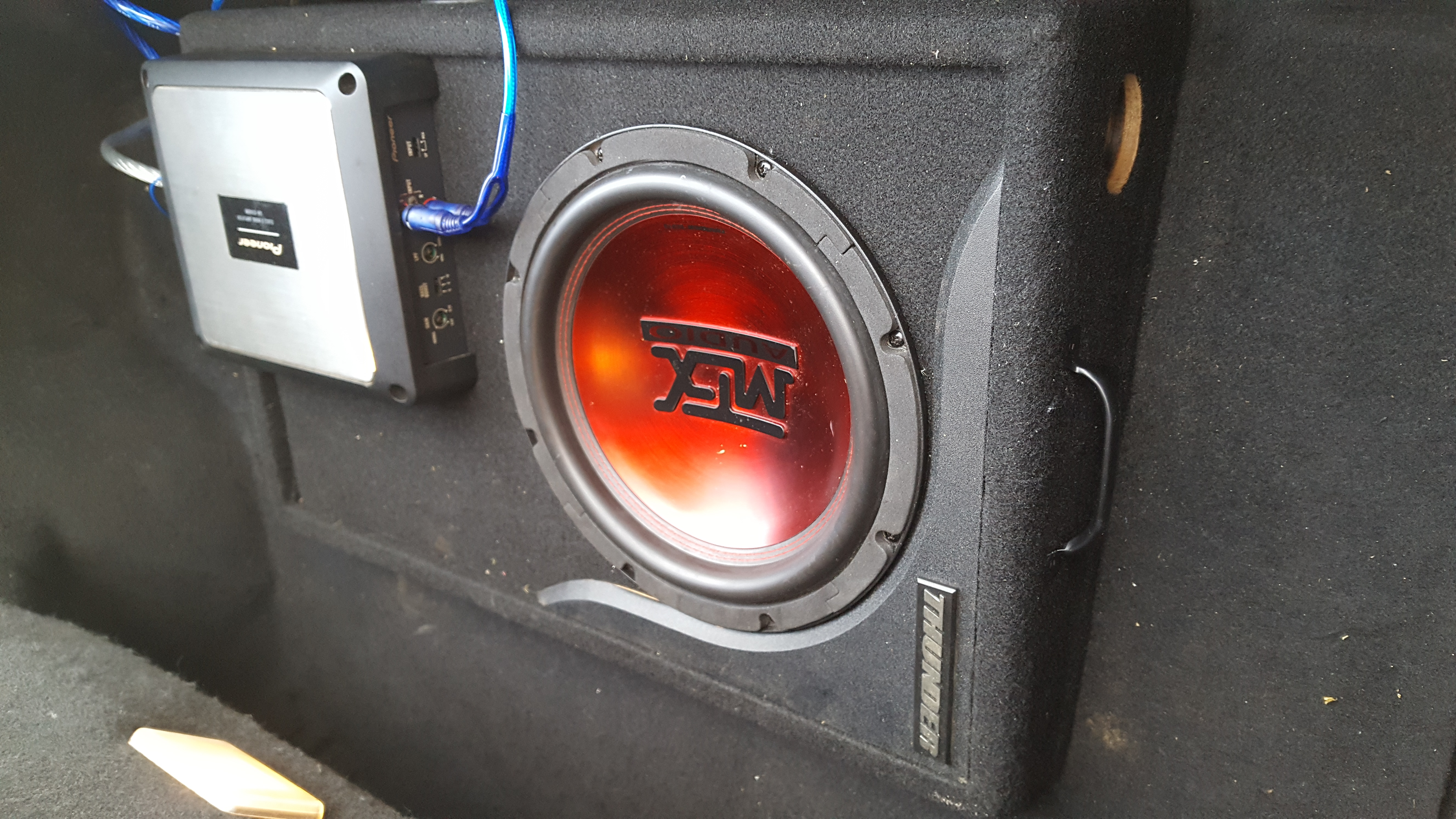 I have an after market JVC stereo if my Spyder and it has a sub outlet.so installing a subwoofer was easy. One thing I did I`d like to share is running the remote wire to the amp on a toggle switch.. Some people don't like all the thumping so I can turn it off or on depending who I`m with. Also the sub box I installed was a MTX Sub with a Pioner Amp. AS you can see in the picture I cut the box down , reported it and let the speaker drop into the center of the spare tire. I covered the bottom of the speaker box with new trunk liner material and then used fiberglass resin ..