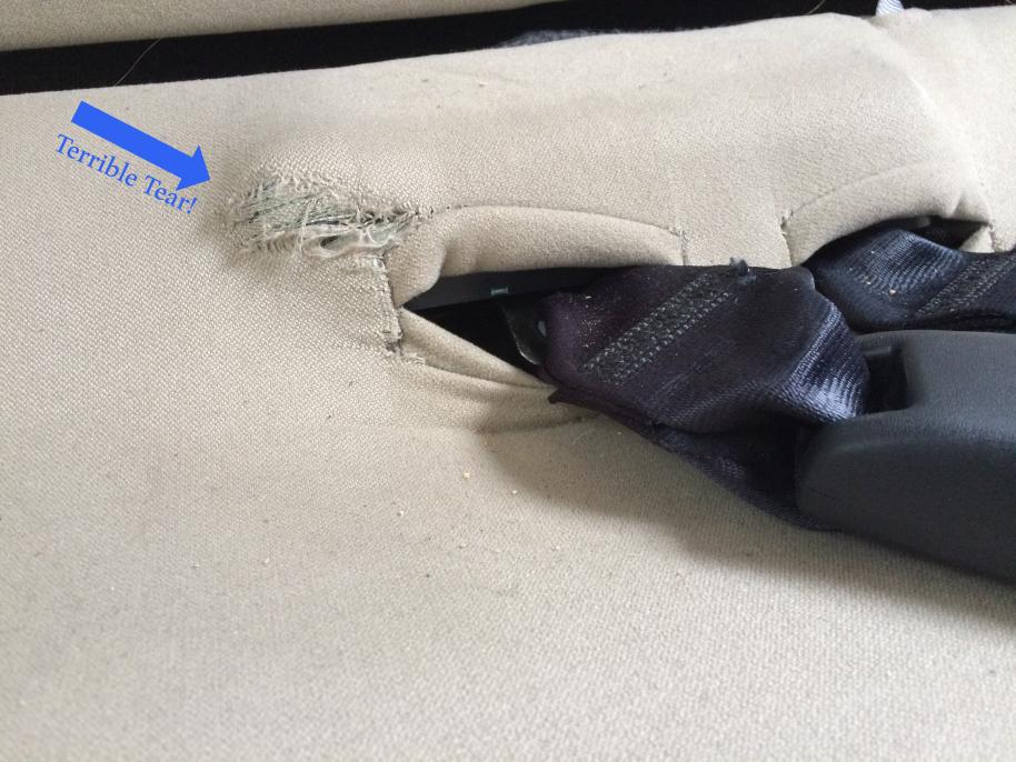 We just purchased a used 2013 Outlander SE and use the 3rd row seat almost every day. We have noticed that there is a tear right where the seat belts are. I have nicknamed it the "Terrible Tear!" I have searched for 3rd row seat covers and have had zero success. Is there any thing I can do to fix this and keep it from happening again? Or is there anywhere I can by a 3rd row seat cover from?