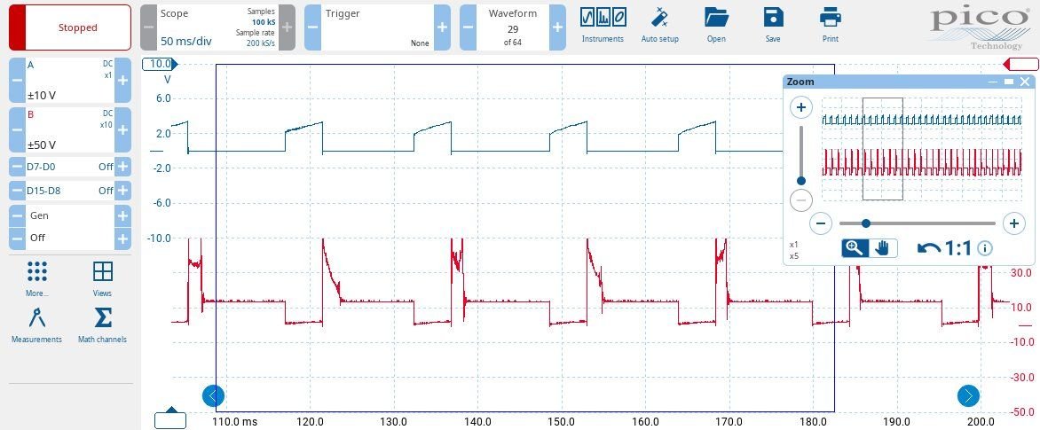 The dynamic test: Pin 1 receives the pulse from the ECU, pin 2 is ground, pin 3 goes to the coil. With ignition on, pin 1 has 0 V, pin 3 has 12 V. When running I get "out of range" even when setting the probe at 10x, more than 50v. Is this normal? Trace A is the input from the ECU, trace B is the coil output. There is variation in the width of the pulses. This might account for the weak or intermittent spark I had measured weeks go, in relation to the length of the spark plug wires. The shortest one ran perfectly and as they got longer there were more and more missed sparks, as described above in this thread. Does anyone know if the shape of those pulses is normal? I'll report back when I install the new power transistor already on order.