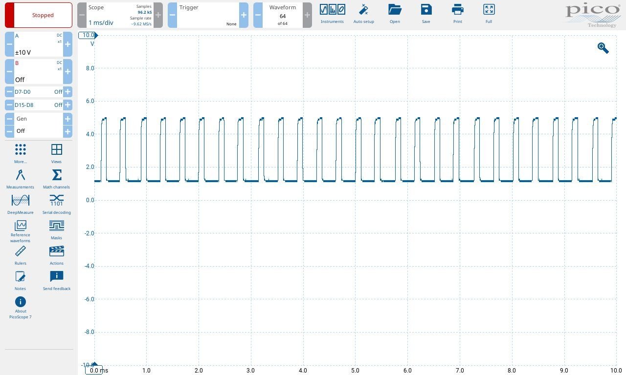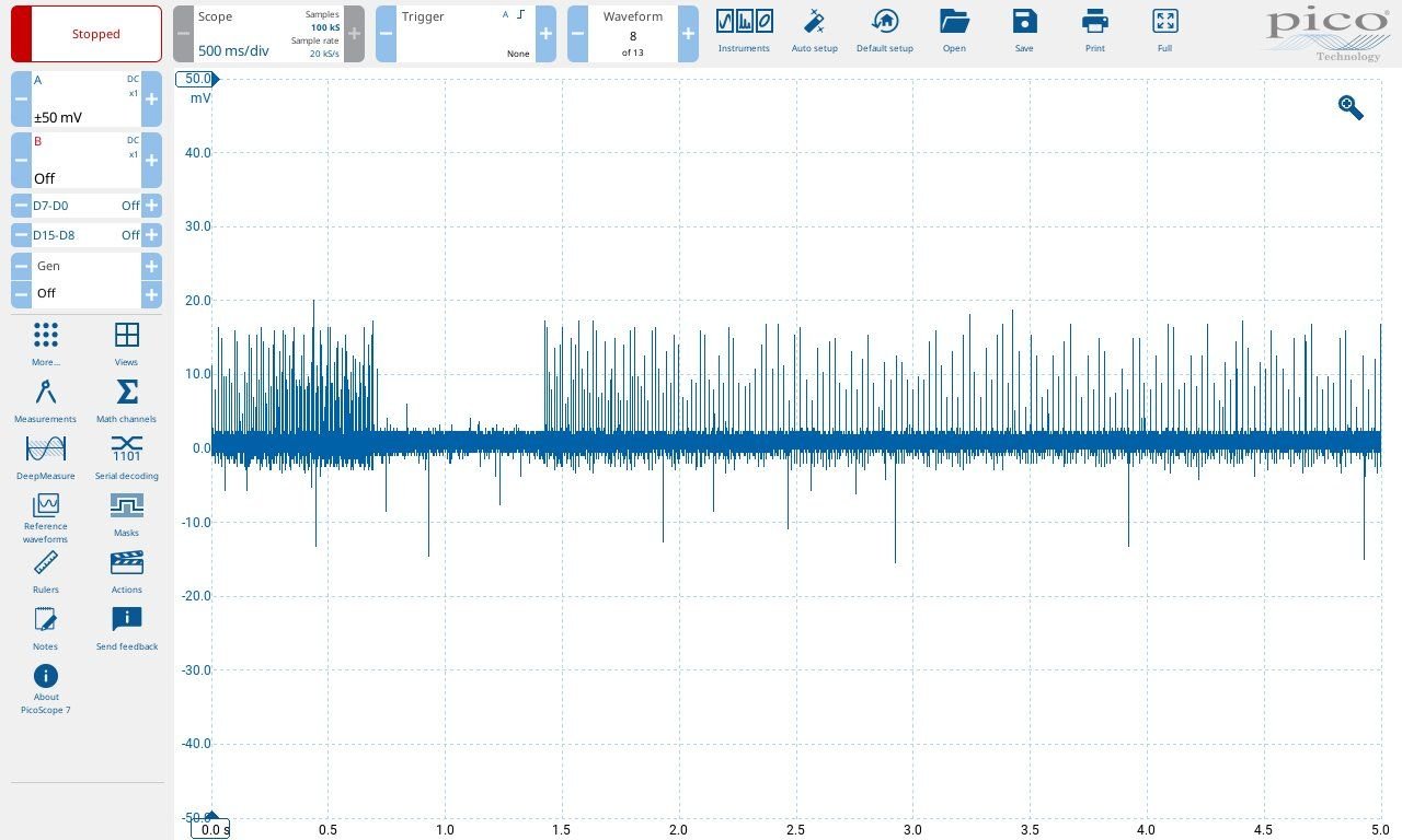 New error code: "Vehicle Speed Sensor (Reed switch)" per page 14-77 of the manual. See the waveform below. But how can this be relevant if I haven't moved the car since I replaced the power transistor and coil? Not sure how the computer figured this out, but the test procedure on page 8-173 determined that the reed switch's transitions from conductive to non-conductive 4 times per revolution of the speedometer cable were not smooth. This is on the new (used) instrument panel I had installed to fix the non-working fuel and temp gauges. This same test confirmed that the old panel had a perfectly working reed switch, so took out the fuel/temp gauges unit from the new panel and put it in the old, and re-installed it. After clearing up the error codes by unplugging the ECU for 10+ seconds, no more error codes.