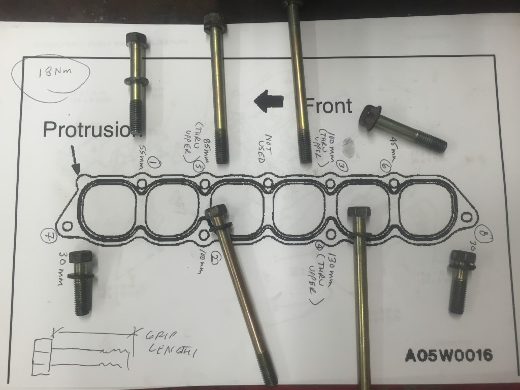 The bolts are of various lengths and the manual does not provide a torque sequence. I measured the bolts and labeled the diagram to aide others in this job. Note that one of the tapped holes is not used and there is not a corresponding hole in the intake. Lastly, I used my judgement and determined the bolt pattern I would use to torque the bolts. The gasket has a tab or ear which goes to the front.