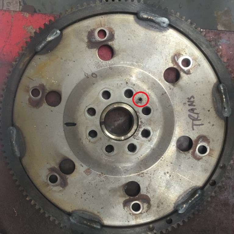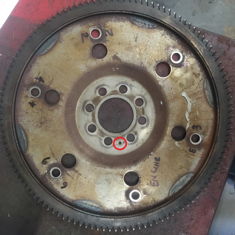 There is a metal plate that bolts to the back of the engine that is held with one bolt and it registers with the two dowels in the block at the 3 and 9 o'clock positions. I had labeled the plate's orientation at time of disassembly. I had removed the dowels so as to bolt the engine to the stand. These dowels engage the transmission bell housing to ensure concentricity.