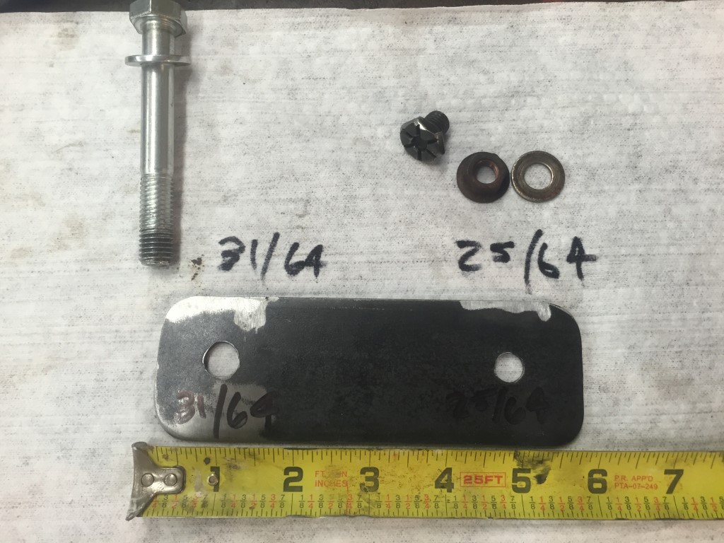 I made a anti-rotation tool so that I could torque the bolts to the crankshaft. I sized the holes in the bar stock to the diameters indicated. This gave a nice fit to the stop bolt in the block as well as the bolt thru the flex plate. The bolt at the flex plate was one of the torque converter bolts and I used a nut from the exhaust manifold.