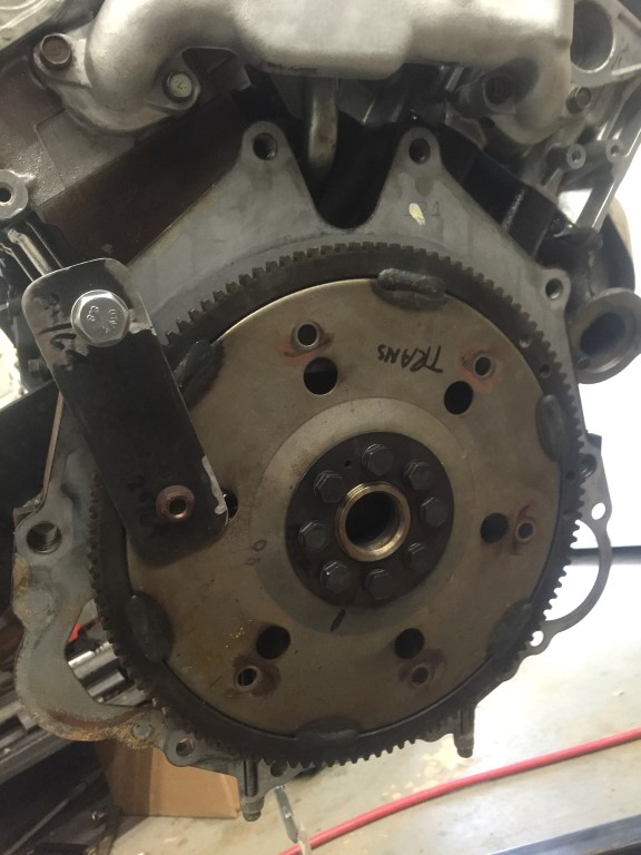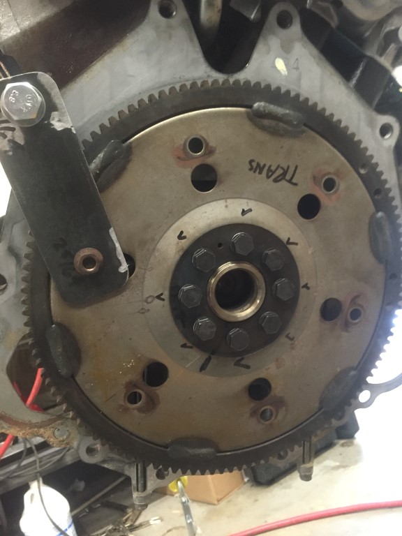 The crankshaft bolt pattern has an index hole that is used to align the crankshaft adapter, flex plate, and adapter plate. I labeled the engine side of the flex plate bolt holes for the converter bolts to aid assembly and indicate the torque sequence I will use. The adapter plate is a stamped piece of metal and the perimeter edge is slightly raised up. The raised edge or lip goes towards the transmission.