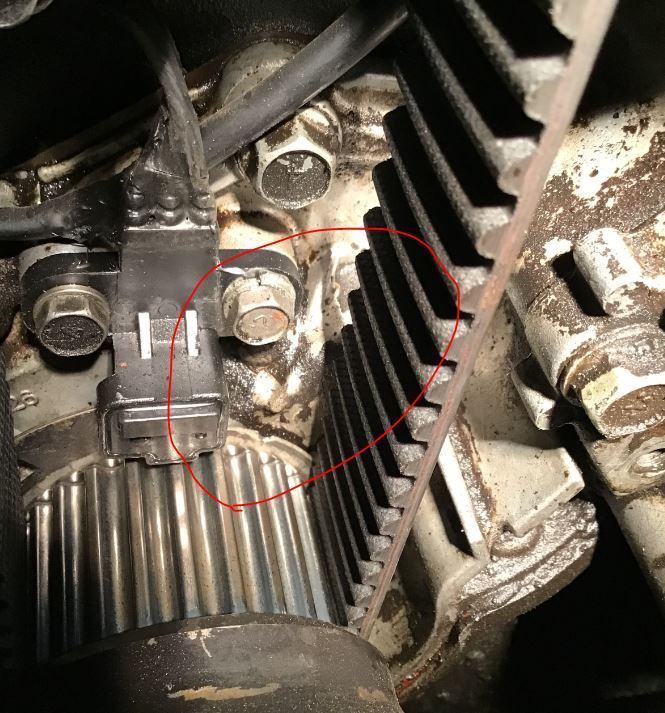 Here's what the timing marks look like on the crank. The mark is on the back of the gear so it's easy to see with the pulley still in place. Timing marks on the crank with the pulley in place.