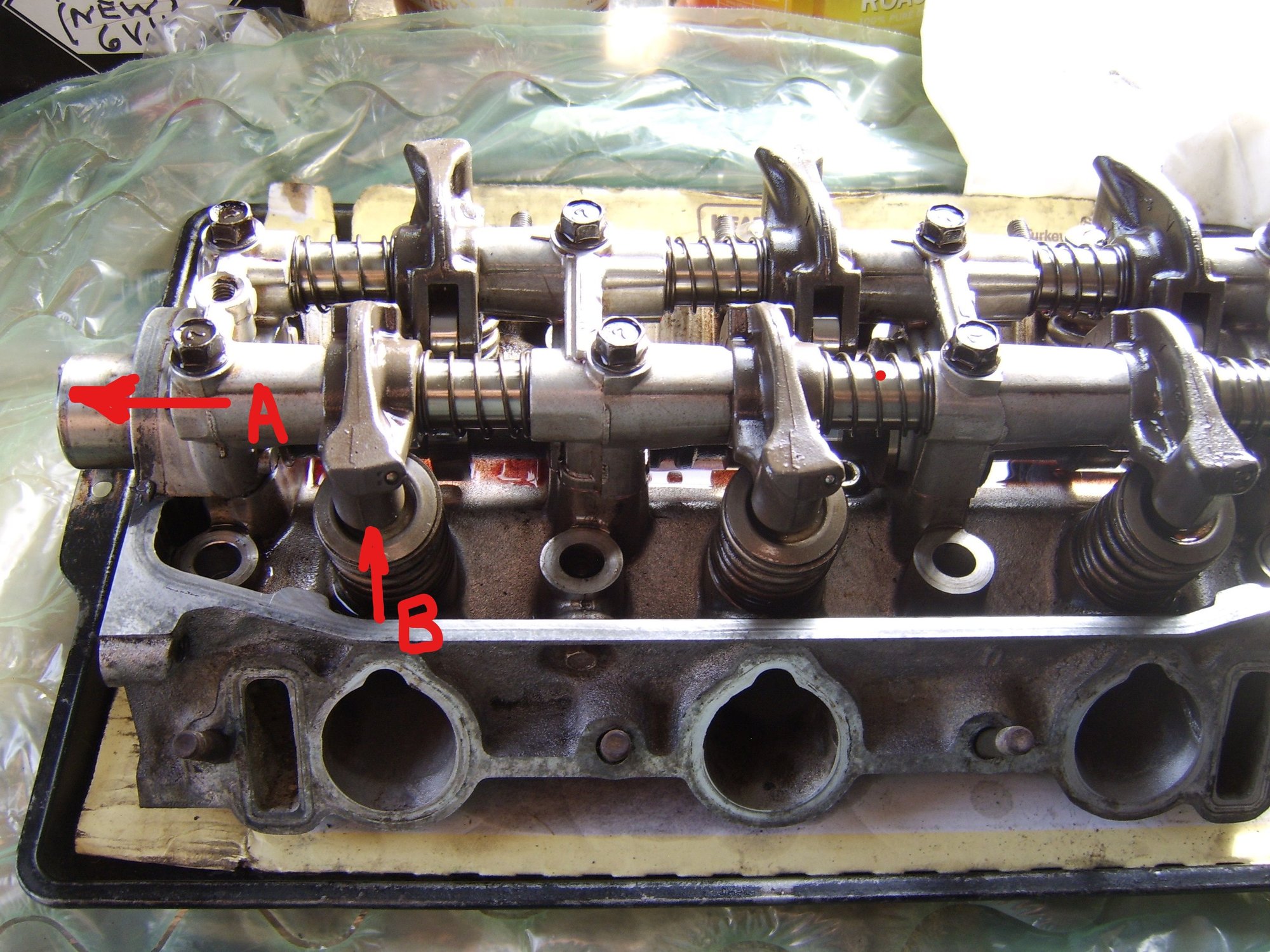 In this pic, I have the "A" marking the cam shaft and the direction it would go as it "popped out/moved forward" as you mentioned. "B" is the location of one of the lifters. Would it be possible for a lifter to fall loose from its slot as the cam popped forward? Looking at the pictures, I dont see how that would be possible unless there were alot of loose bolts holding the camshaft/lobes in place.