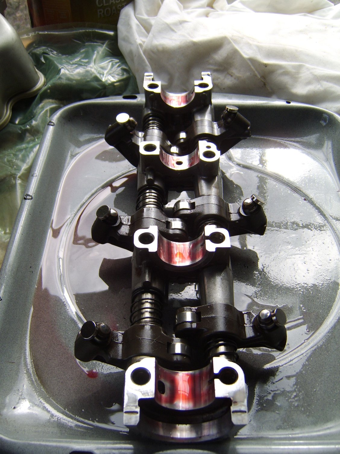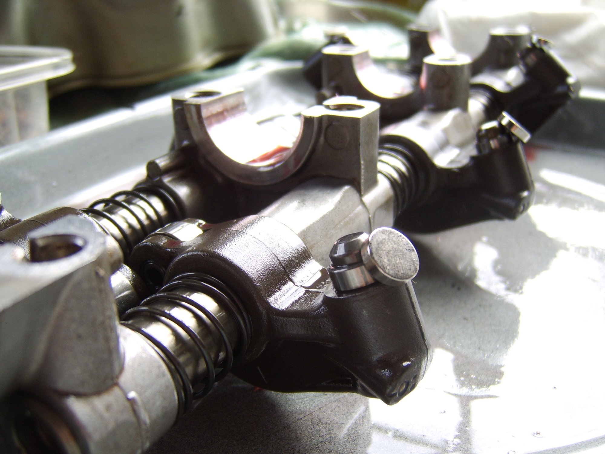 You can see the small dome-shaped lifters with magnets on each one (just my attempt to hold them in place as I flipped over the rockers to install on the camshaft).