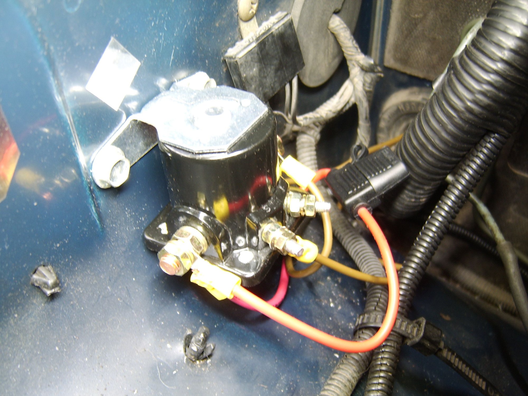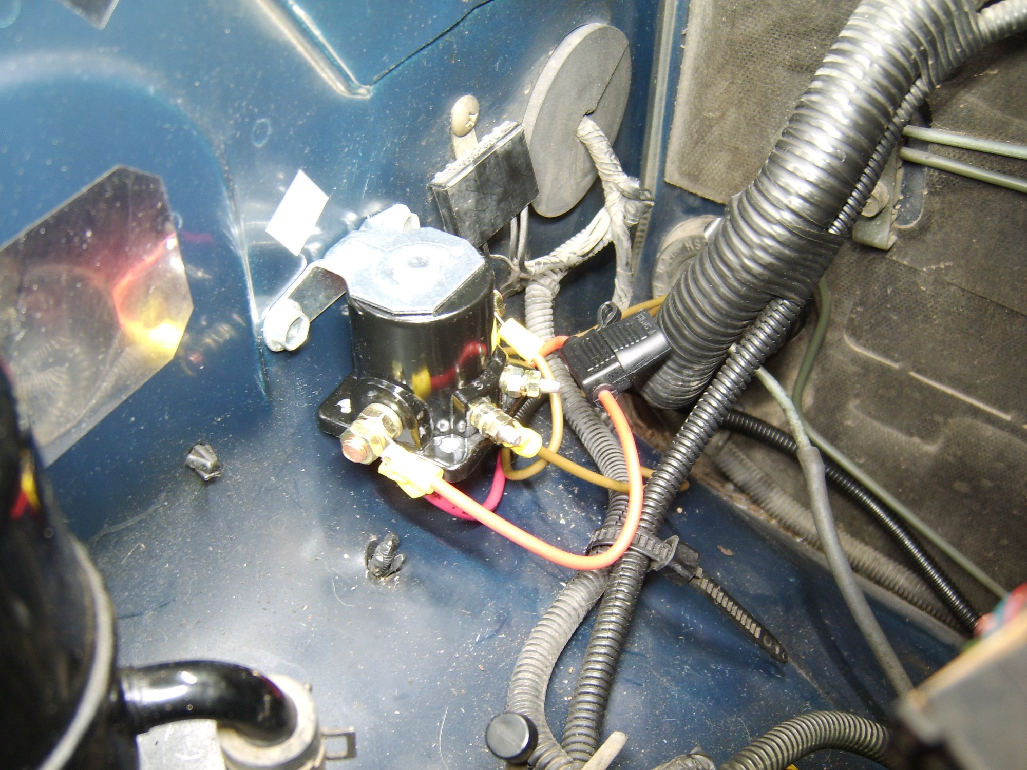 I am drawing power from the positive battery terminal end at the starter solenoid, and another "Trigger" wire runs from this Ford solenoid straight down into the existing "Trigger" wire that plugs into the starter solenoid: