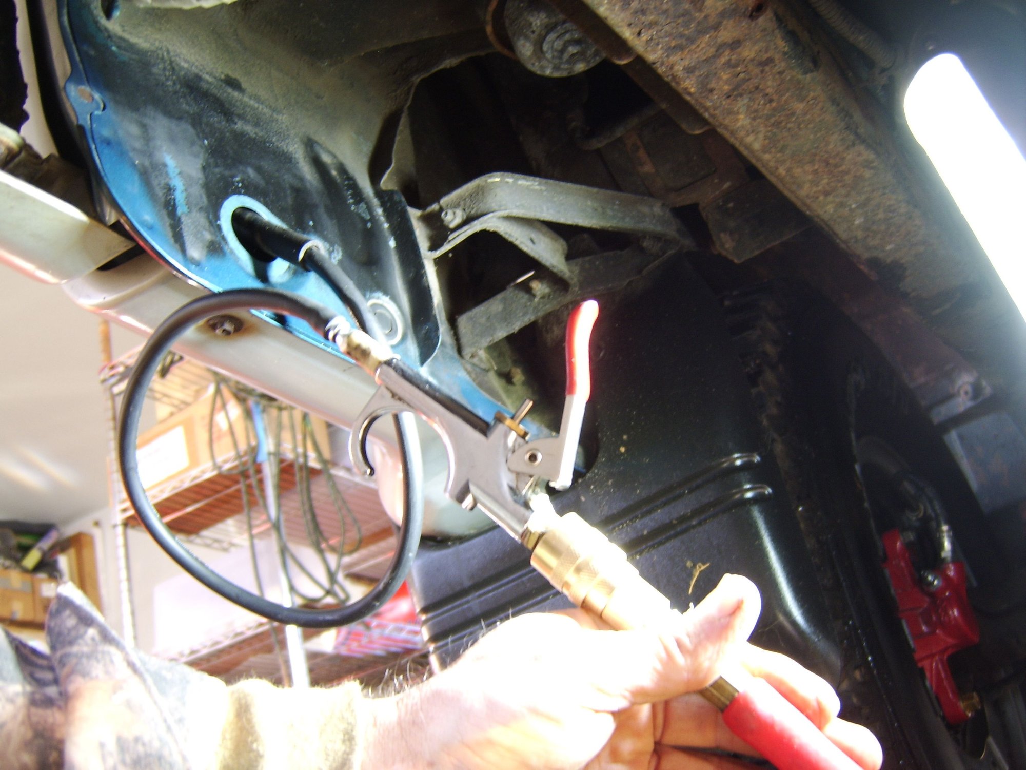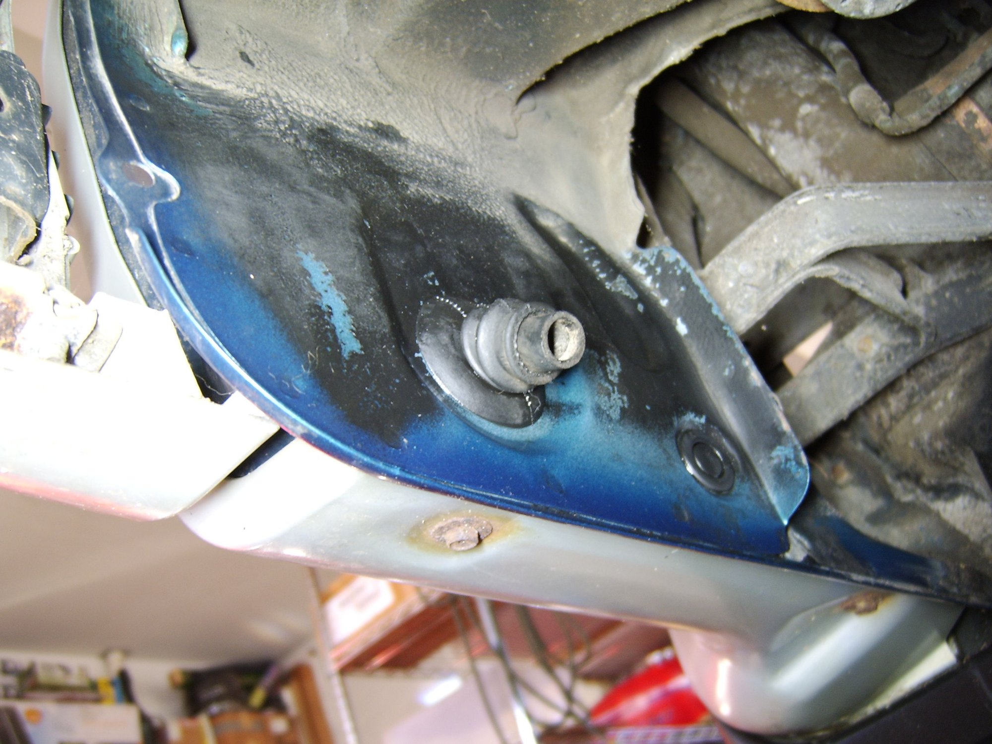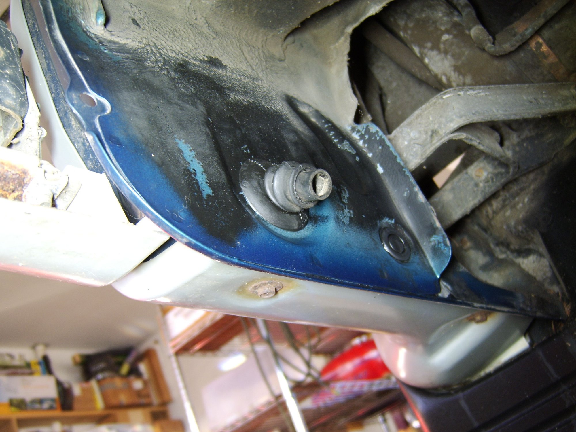 The metal inside this plug hole looks perfect, with some type of grey paint applied to it.....and no sign of water ever dripping down in this area. So, maybe the drain tubes come out someplace else? Anyone ever discover where these front drain tubes exit at? Guess my next step is to inject tranny fluid down these tubes and look for the leaks.