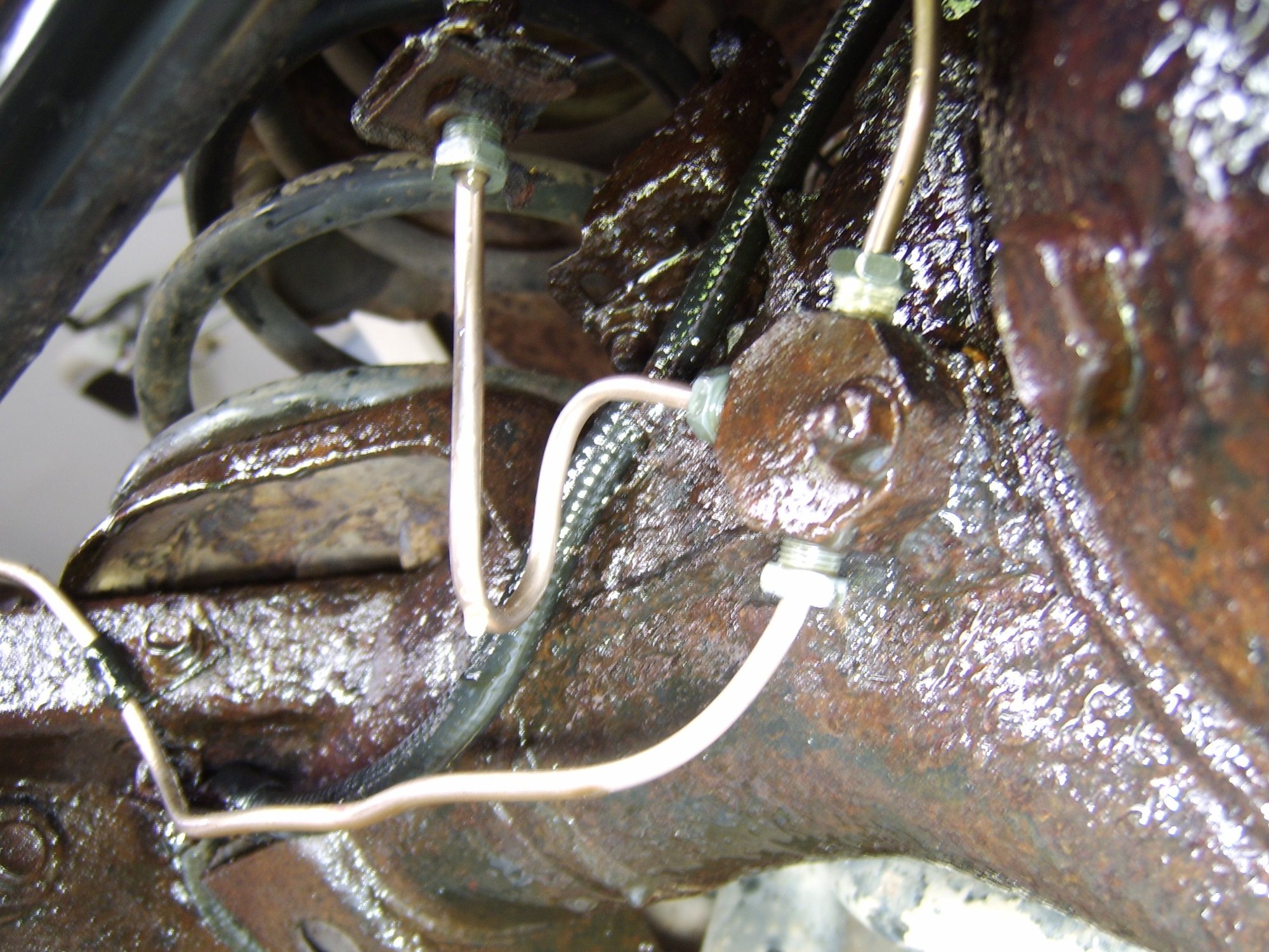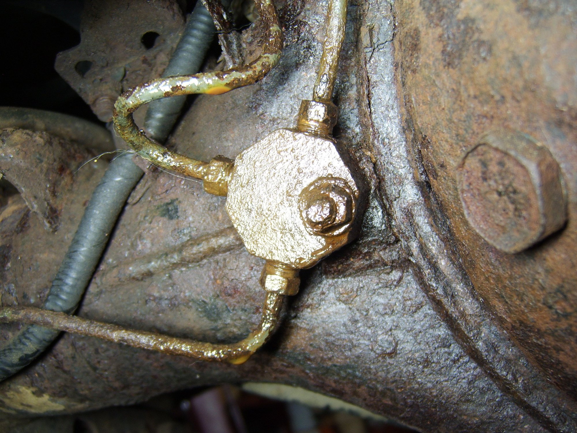 Here is that T connection on the left side of the diff: I had been wirebrushing, picking, and soaking with PB Blaster for weeks, and still cannot get the fittings to budge. So that was one reason for using the compression fittings as a quick fix. Does anyone reccomend heating the brake line connectors to help break them loose?