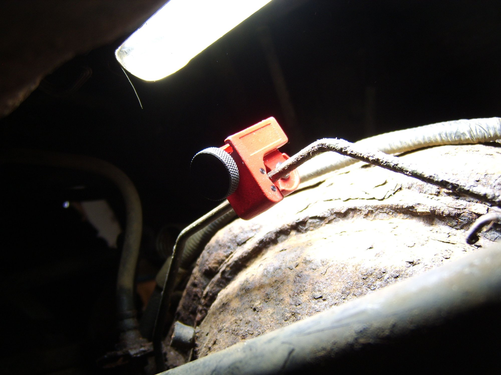 Finally got the copper/nickle rolls of 3/16" tubing, and a ton of fittings. I went ahead and tried the compression fittings on this short repair. Here is the wee-little tube cutter that came in a $12 flare tool kit on ebay. I first sanded the rough rusty surface of the line where I was gonna make the cut. Wiped clean and then this little cutting tool worked great: