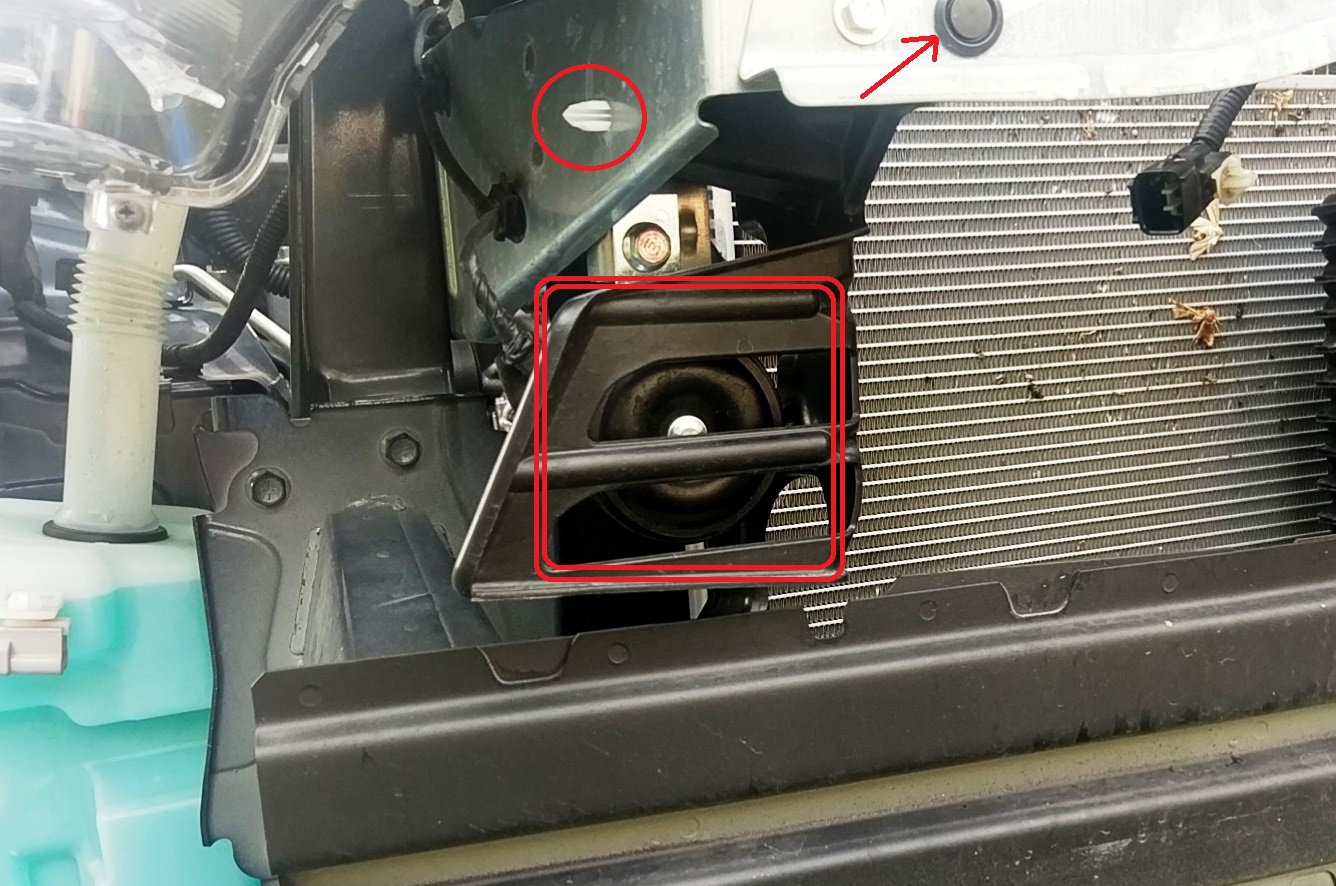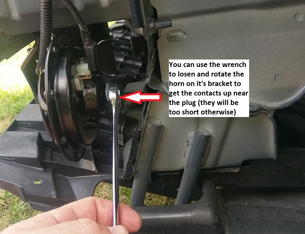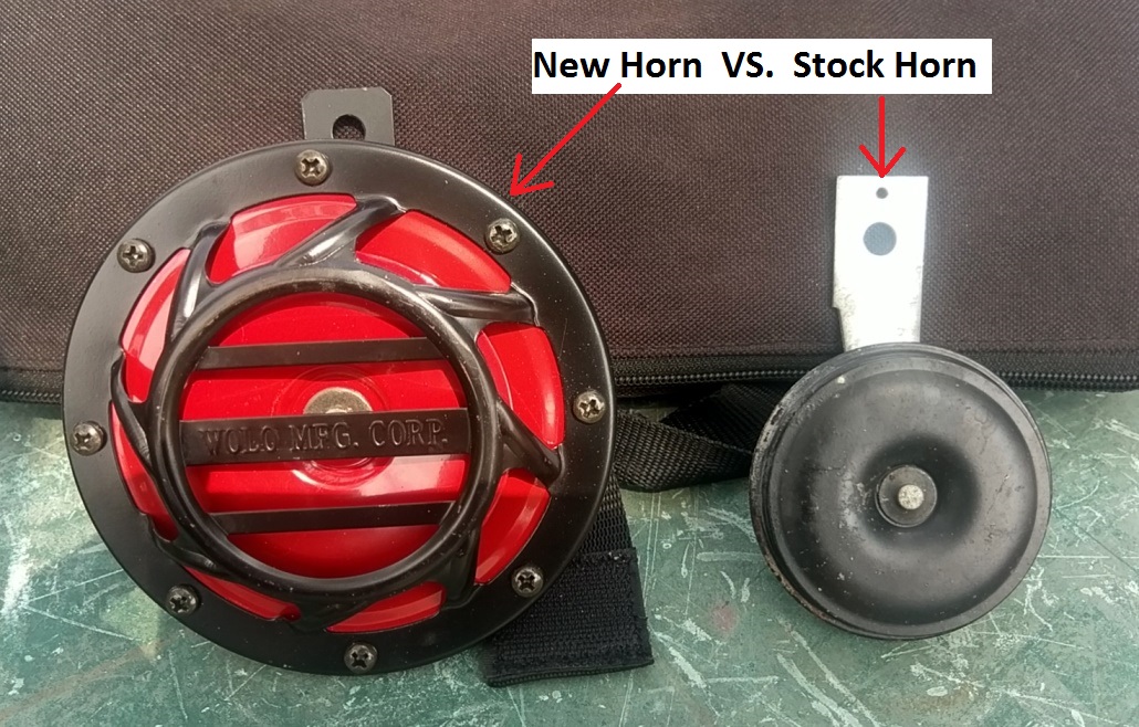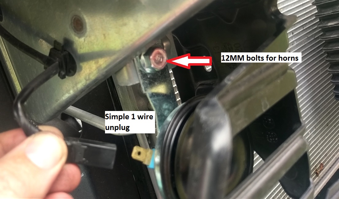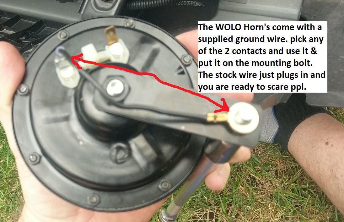 I've outlined some info in the pics about the horns as well, and shown where the removal points are for the horn shield and mounting locations. I used a WOLO horn set from Advance Auto Parts and they are MUCH better than the puny stock horns that Mitsu uses. All that's needed for the bumper removal and horn install is a small wratchet, an extension, a small blade standard driver (for the pop screws) a Phillips driver (for the special ones under the front of the bumper) a 14MM wrench (to adjust the horns plug location) and 2 sockets, 10MM (all for the grill and bumper) and a 12MM (for the bolts that hold the horns) NOTE: you'll reuse the stock horn bolts (unless you opt for a custom location for them) The WOLO horns just need to have the ground pigtail added (pick either terminal, it don't matter) and put that over the bolt before you screw it back in. I also cut away the stock horn shields front section using a utility knife to give the new horn some room. It's important to put it back on to keep air flow into the RAD.