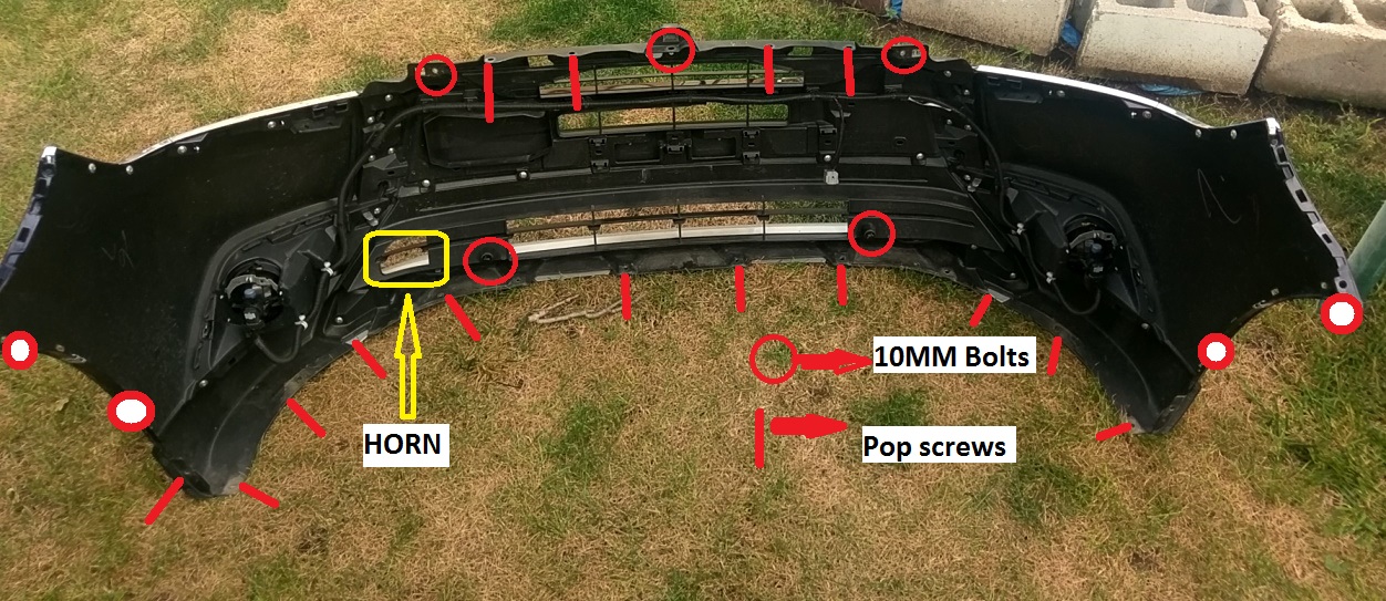 Next is the actual bumper: If you have the plastic wheel trim, they too pull straight out, starting at the bottom. You will see in the pics provided in the following posts the positions of where the bolts are and all the pop screws. NOTE, that under the very front there are some screw style ones that simply take a phillips driver to remove. (I found it helpful to reach through and push down on the center while trying to un-screw them) There are nine, 10MM bolts to remove, I've shown their location in the pics with RED Circles indicating the bolt locations and RED lines indicating the pop screw locations.