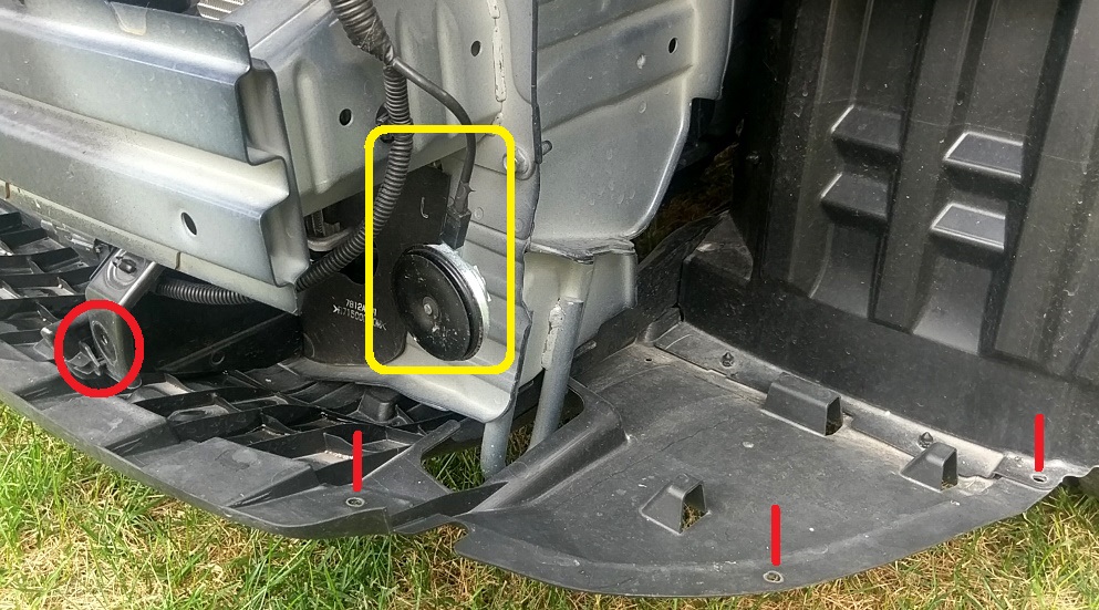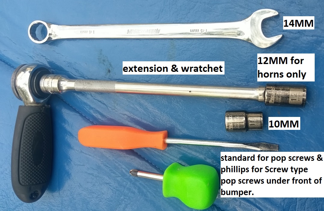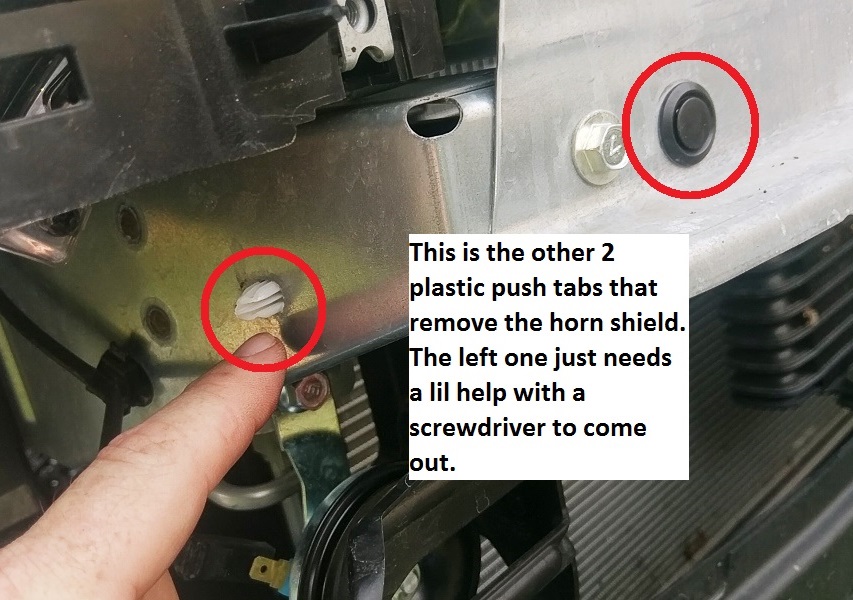 To start things off, it's just a matter of knowing or finding all the pop screw places and the few bolts that hold the front bumper onto the vehicle. I wanted to add some new horns and this weekend was a good time to get it done. The radiator cover comes off with pop screws, then the front grill section has 2 bolts (one on each side) and some pop screws. You just need to pull on the grill and there are some release tabs that will just pull out and you're done with that part. (try to pull straight out, don't worry, it'll pop out)