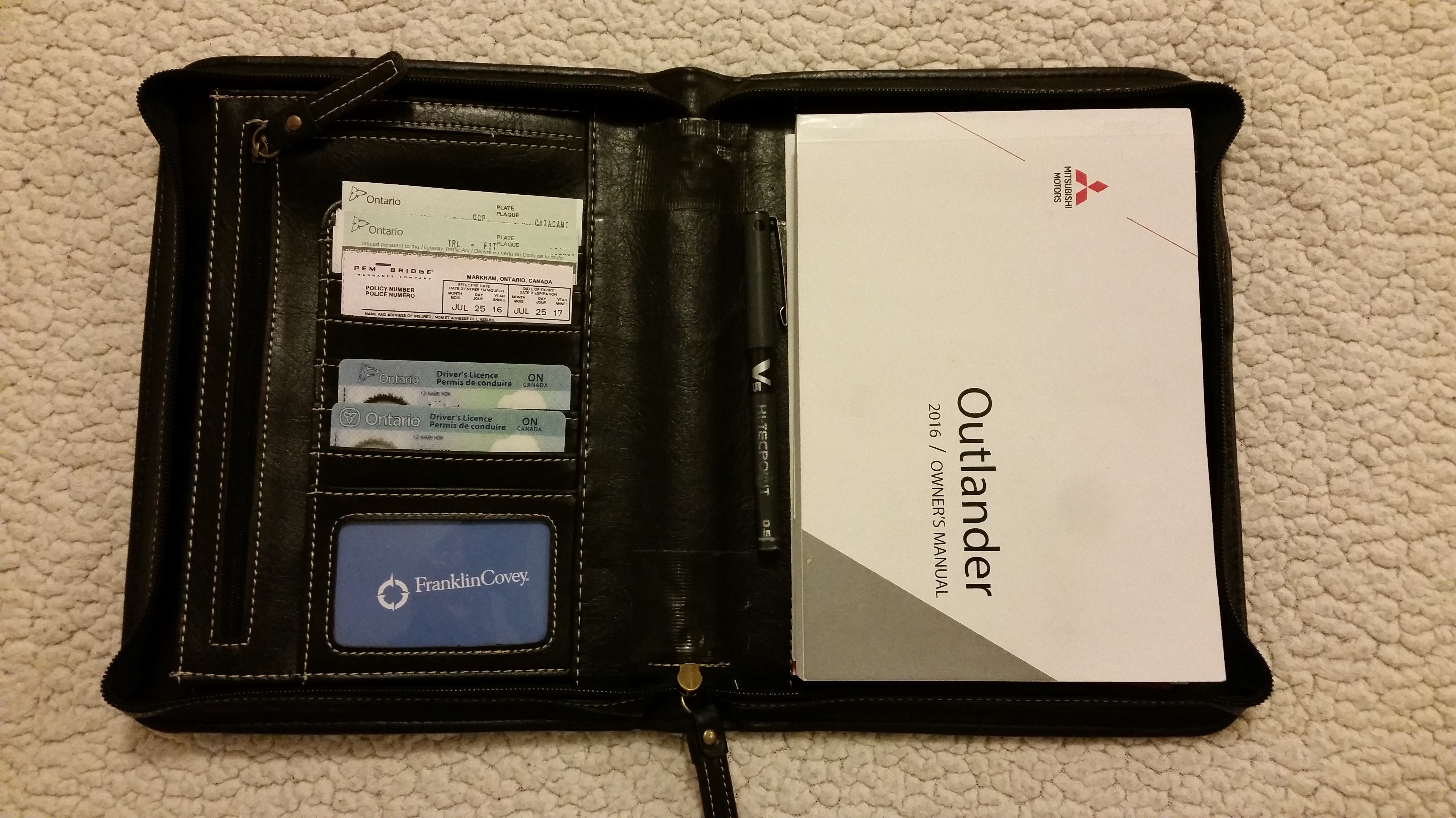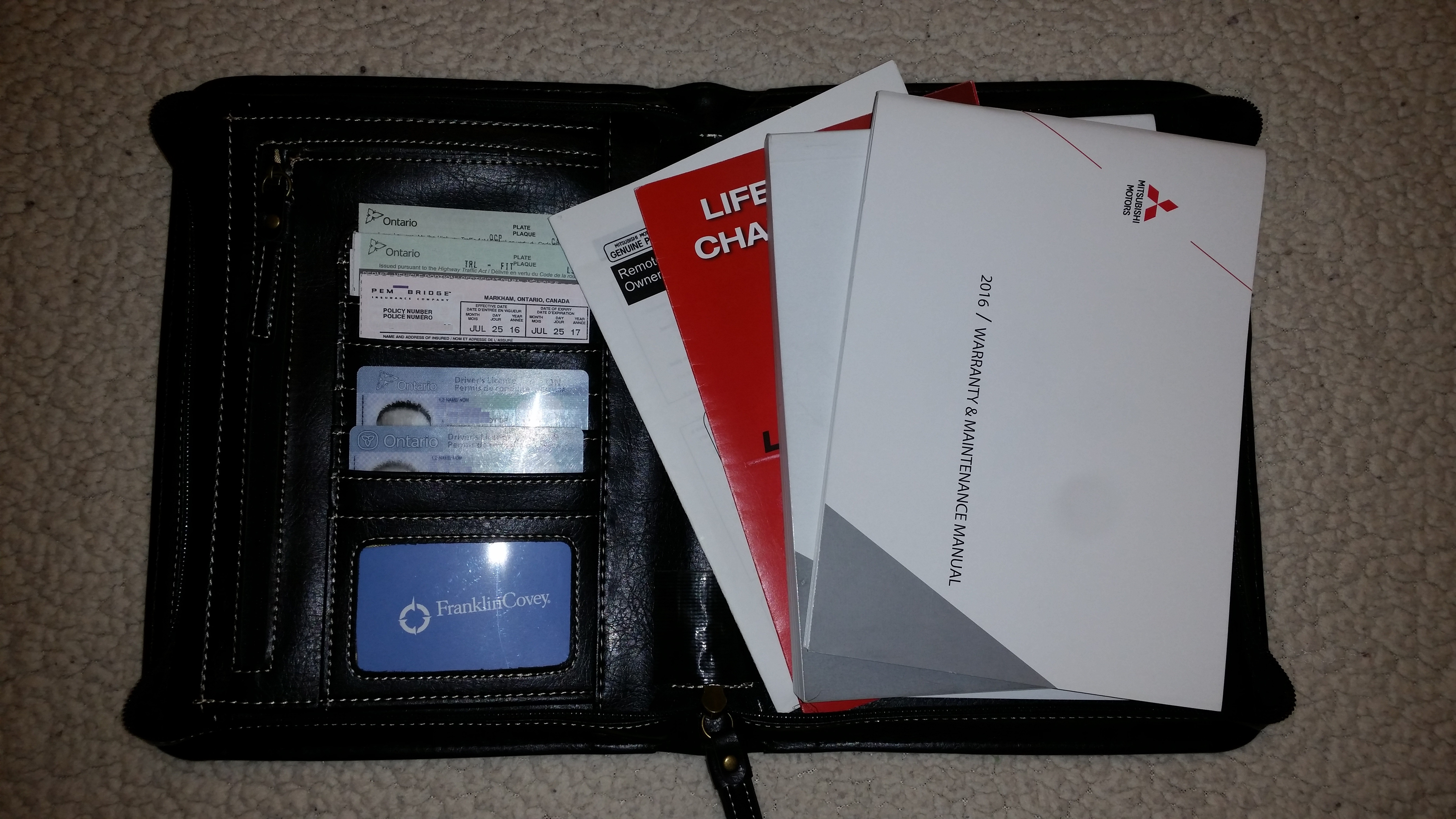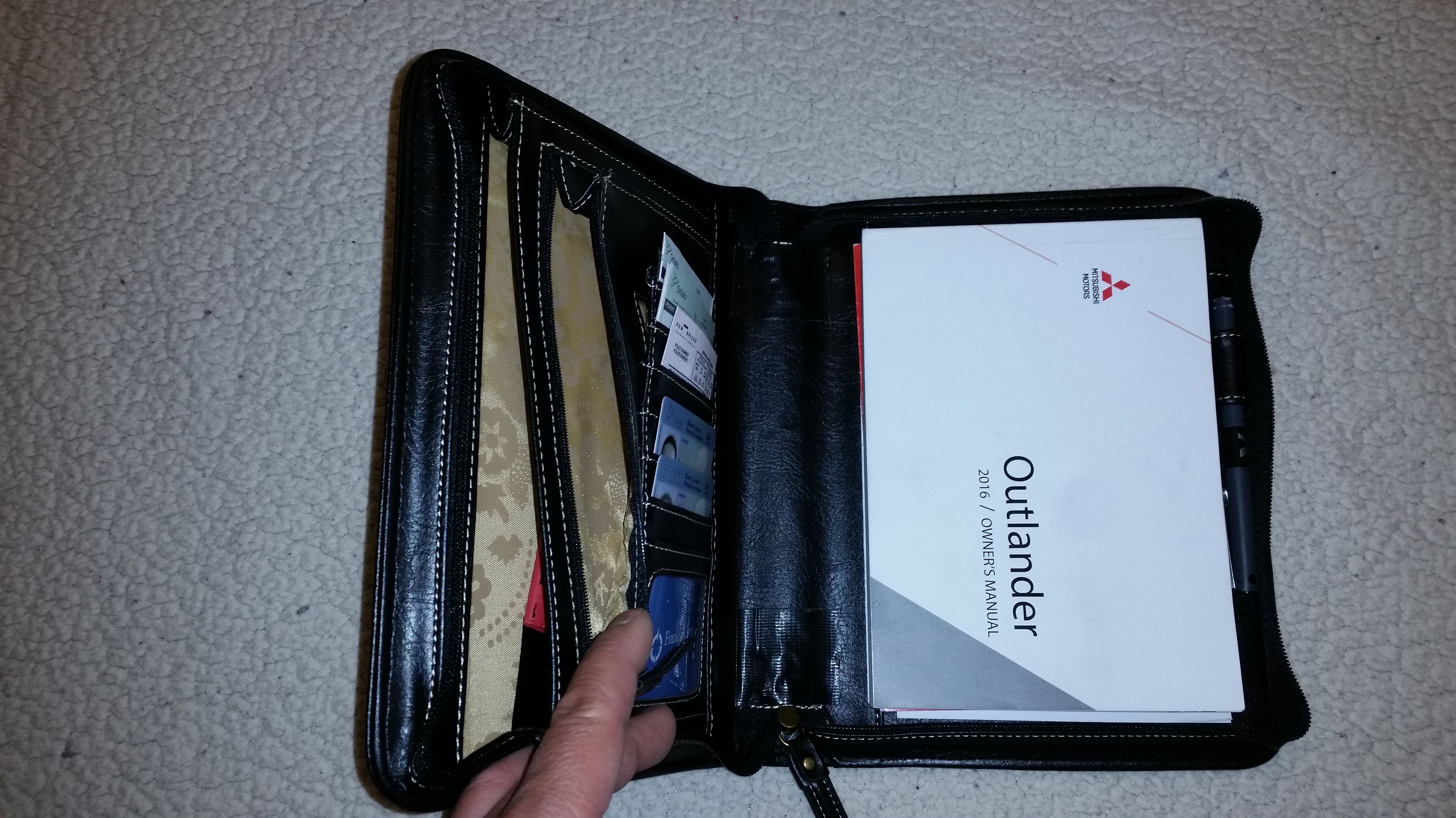 Since Mitsubishi doesn't give you anything but a cheesy manila envelope for the manual, I got an idea to find one. So today I went looking for something to put the owners manual in. I was going to check for something at a local yard, but ended up finding a used Cambridge day planner at a GoodWill (thrift store) that's a few blocks from our house. This works "perfect" and only cost $2. There were 2 allen screws that held the page binder inside it, I took out the binder portion and Ta Da. nice leather case for all the car "stuff", ins. card, registration, etc. to fit it all nice and neat.