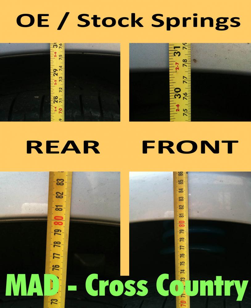 I fitted my 2008 2.2L diesel Outlander with a set of MAD Cross Country springs and the result was a rise of ~30mm in front and ~45mm in the rear, thus leveling the car. (usually the rear is sagging)