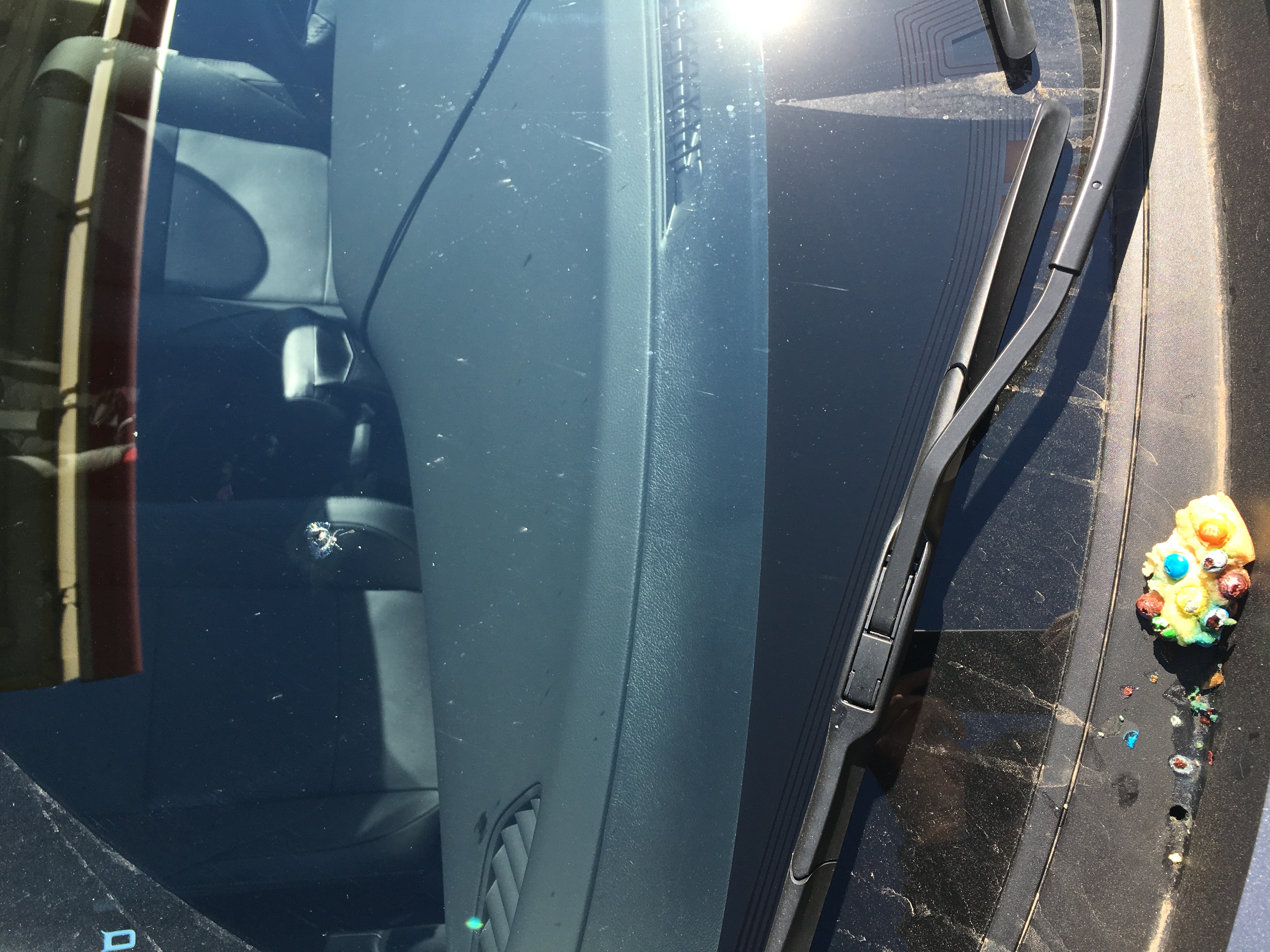 A month ago, someone threw an m&m cookie out of their car on the highway. I didn't catch who. It deflected of my hood and hit my windshield. It cracked my windshield but miraculously there was no damage to my hood.
