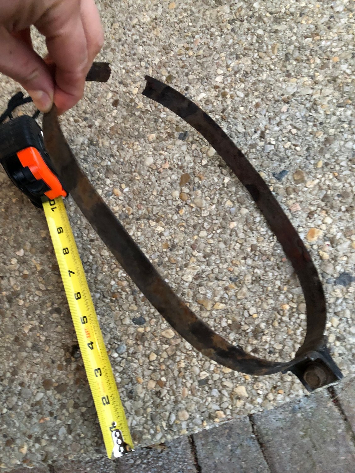 The metal band is about 1/2” wide but when the ends are joined, the oval it forms is 10” across (to fit snug around the muffler body). I will post a photo when I get home. It looks like it may have held a heat shield around the muffler itself, but I don’t think there ever was one around the muffler, and I have been the only owner of the vehicle. It looks like it was just tightened around the middle of the body of muffler before it broke, but it doesn’t look like it was doing anything, or attached to any hanger on the undercarriage.