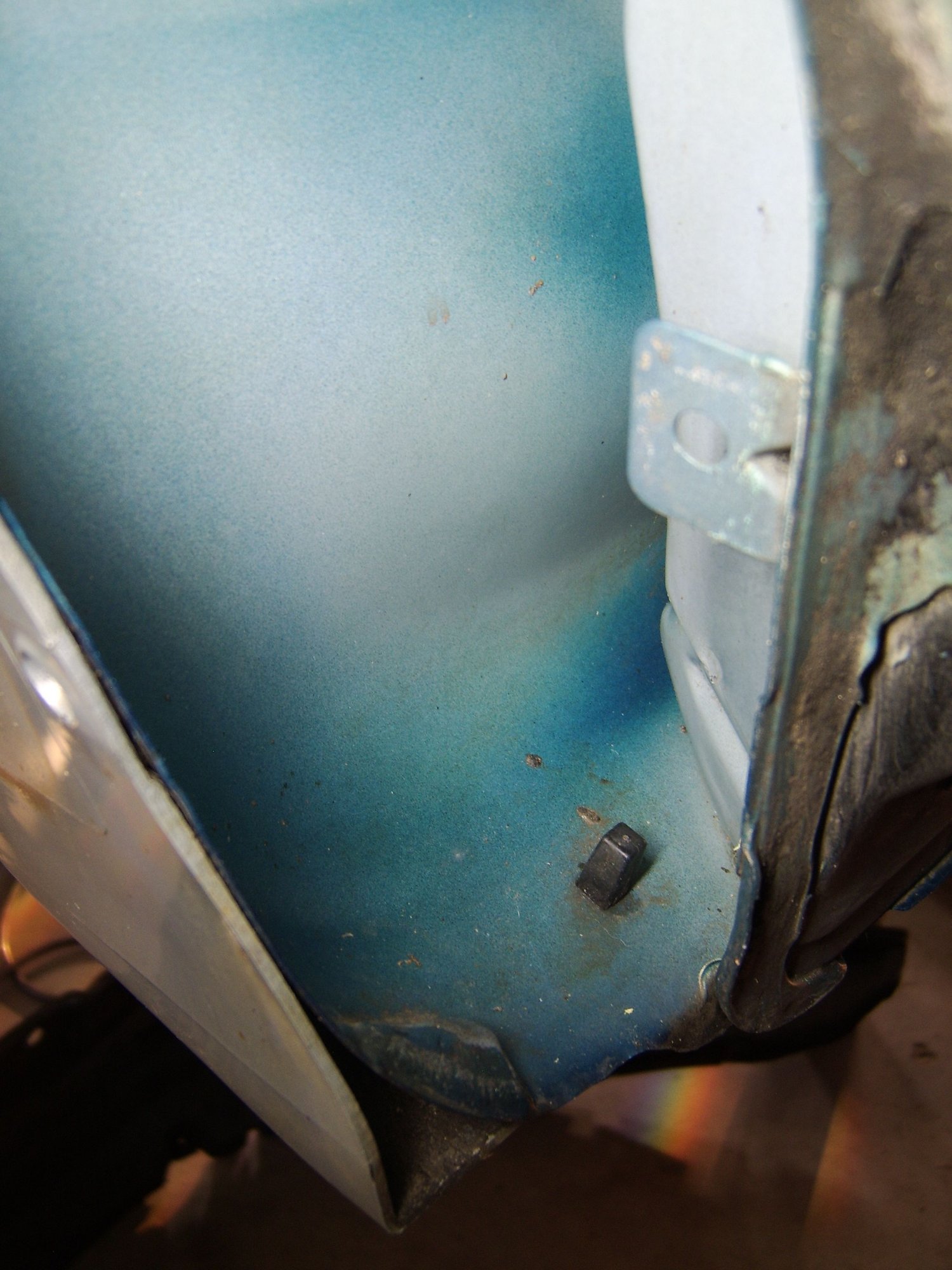 After cleaning, we have a perfectly new looking metal fender panel......whatever primer Mitsu used from the factory was doing its job and there was no rust whatsoever under the pile of muck: