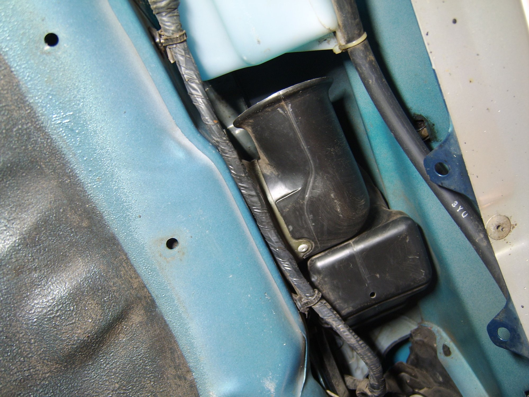 Pic after cleaning the area: Notice at the very top is a black "horn-looking" cylinder in front of the headlight washer resevior. It has about a 2-3 inch dia opening, and appears to be the air intake going to the engine airbox/air filter. With the plastic fender liner in place, it seems to me that the air intake is pretty restricted.....has anyone else seen this and opted to drill out another air intake to the air filter box?