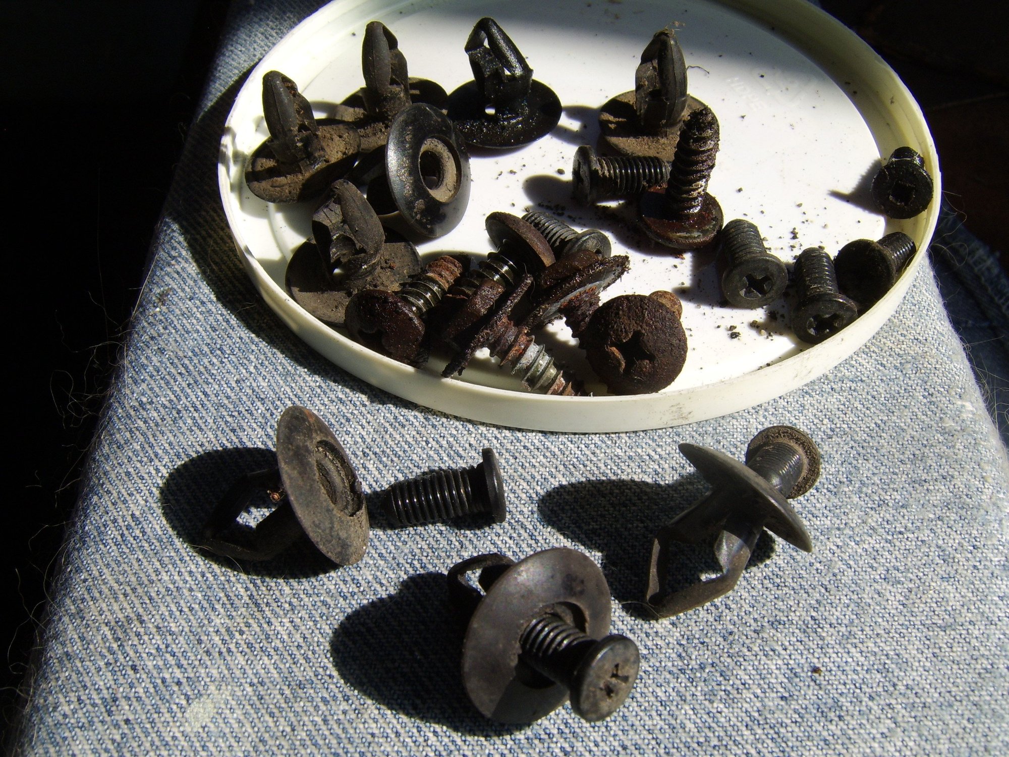 Here are the screw clips that hold the plastic inner fender in place. Most are plastic phillips screws that go into the clip, and the heads will strip out if you are not careful. Also, some need to be pryed a bit outward as you screw to get the sucker to come out. Im gonna try to order new ones to have on hand.